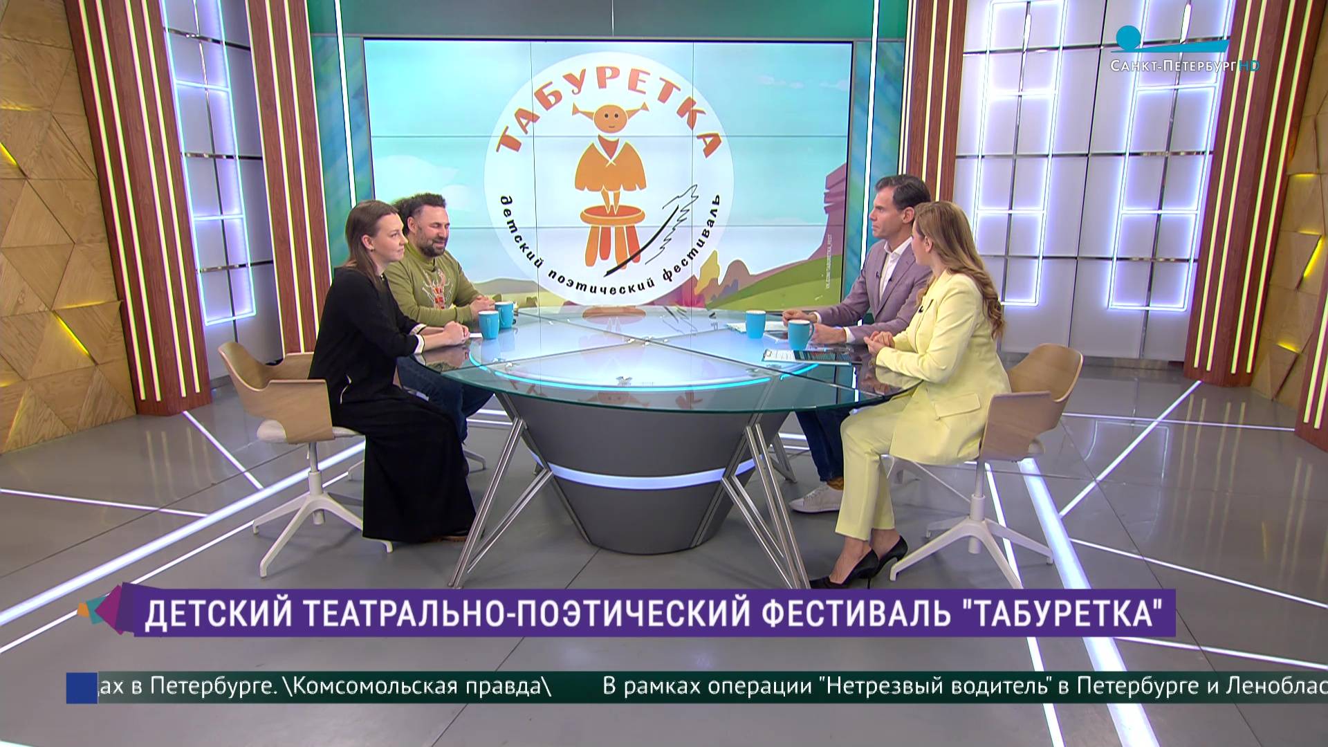 В студии программы «Утро в Петербурге» Евгений Шлионский, организатор детского театрально-поэтического фестиваля «Табуретка» и Екатерина Романова, актриса, режиссёр, педагог.