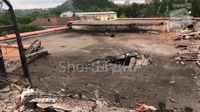 Прямое попадание украинского снаряда в крышу роддома больницы им. Вишневского в Донецке в результате обстрела города 13 июня 2022 года. Разрушена бетонная плита перекрытия. На горизонте виден дым от сегодняшних обстрелов со стороны ВФУ Киевского района Донецка