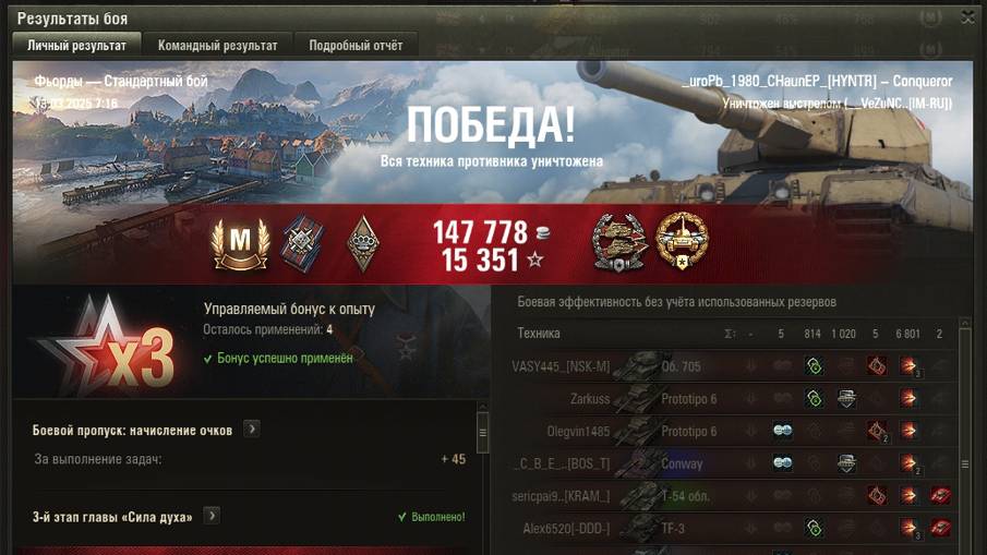 ФЬОРДЫ МАСТЕР на Conqueror ОПЫТ: 1462 СУММАРНЫЙ УРОН: 7615 медаль ПОДДЕРЖКА КАЛИБР