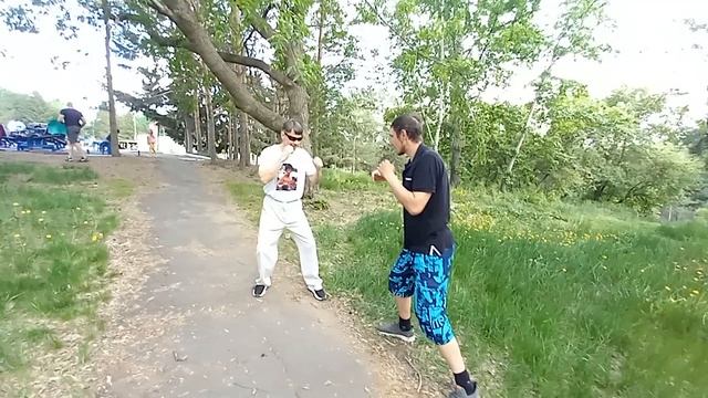 От прямого удара залом руки и способ как положить противника на землю. Удары ногами по ногам.