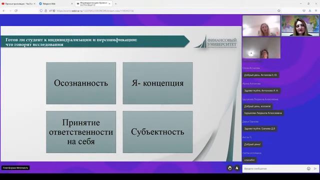 Октябрьский научно-образовательный семинар «Перспективные исследования в сфере образования» Семинар 13 от 12.10.2022г. Финансовый университет совместно с РЭУ им. Г.В. Плеханова проводит семинар на тему: «Индивидуализация и персонификация обучения как современная тенденция развития высшего образования в мире и в России». Индивидуализация и персонификация как противоположность массовому и стандартизированному подходу проникает в различные сферы общества, и становится не только методикой обучения, но выступает трендом развития высшего образования в мире. Приглашаем Вас принять участие в обсуждении следующих вопросов: • Какие существуют подходы и уровни понимания индивидуализации и персонализации образования? • Как вузы организуют индивидуализацию и персонализацию: отечественный и зарубежный опыт. • Как преподавателю «на местах» организовать персонализацию? Докладчики: 1. Константинова Лариса Владимировна, д.соц.н., профессор, директор НИИ развития образования Российского экономического университета имени Г.В. Плеханова. 2. Киселёва Наталья Ильинична, к.с.н., доцент, директор Центра ПИРСО. 3. Александрова Людмила Дмитриевна, к.ф.н., доцент, заместитель директора по развитию и инновациям, заведующая кафедрой «Цифровизация образования» Института онлайн-образования. 4. Селиванова Марина Александровна, к.э.н., доцент Департамента страхования и экономики социальной сферы Финуниверситета. После основных докладов участники смогут задать вопросы и поделиться собственными опытом индивидуализации обучения. Дата семинара: 12.10.2022 г. Время семинара: 16.00 – 17.00 ч.
