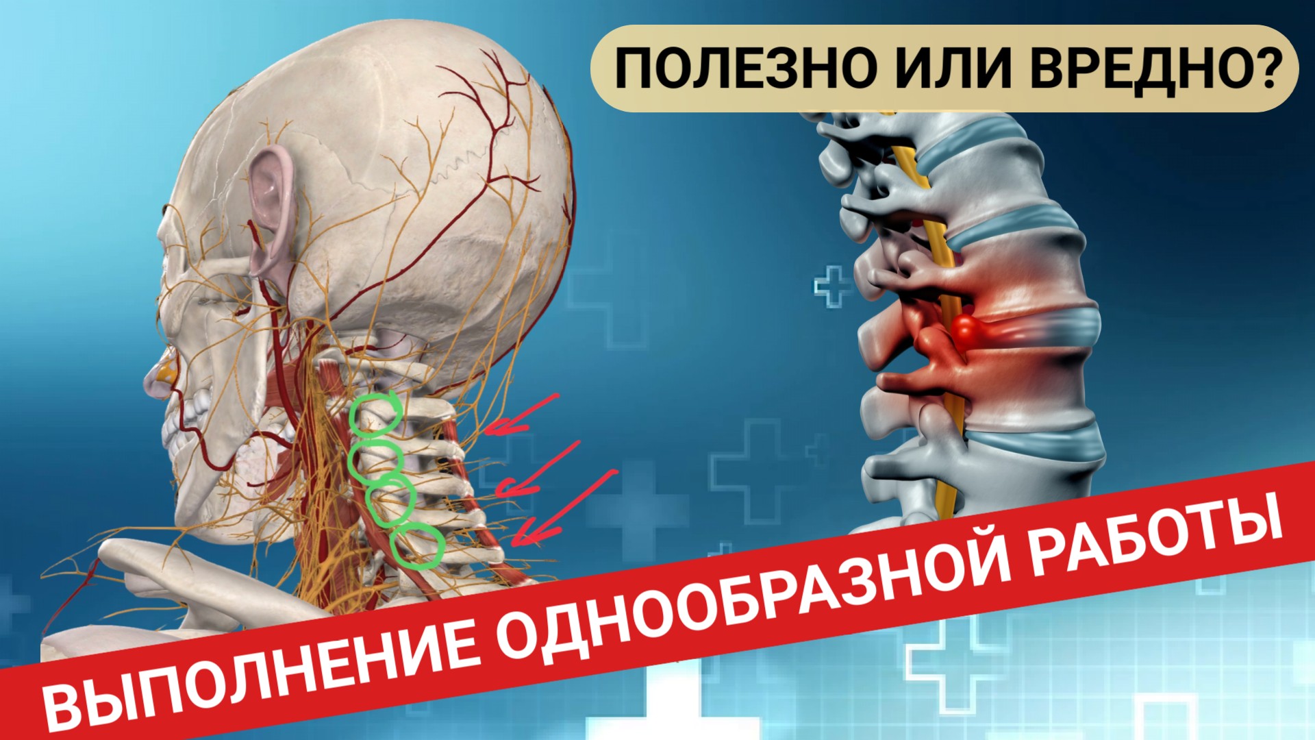 Полезно или вредно выполнять однообразную работу? В наше время всё больше и больше людей вынуждены выполнять однообразную работу, будь то офисные работники, грузчики водители и даже стоматологи. Какие заболевания являются следствием той или иной профессиональной деятельности, а самое главное, как избежать их последствий рассказывает в данном выпуске ведущий нейрохирург Андрей Владимирович Городнов. РАЗМИНКА НА РАБОЧЕМ МЕСТЕ. ОФИСНАЯ ГИМНАСТИКА https://www.youtube.com/watch?v=ZEA-PmNnzPo&t=1s Спасибо, что посмотрели это видео, надеюсь, Вам все понятно. Если остались вопросы, пишите в комментариях. Я обязательно постараюсь на них ответить.? Для записи на онлайн консультацию позвоните, пожалуйста, в нашу Клинику по номеру телефона: 8(4842) 21-00-00 или 28-12-12. Или напишите на Ватсапп: +7 961 123 6968 . Также, можете перейти по ссылке, указанной ниже. Администратор подберет для Вас удобное время и всё расскажет. ОНЛАЙН-КОНСУЛЬТАЦИЯ: https://vk.cc/cfAn71 Мы в соцсетях: Vkontakte https://vk.com/clinicabolikaluga Одноклассники https://ok.ru/www.clinicaboli.ru Telegram: https://t.me/clinicaboliklg Наш адрес: Калужская область, г. Калуга, ул. Болотникова, д. 23.Тел: (4842) 28-12-12 0:00 Вступление 0:48 Профессиональные заболевания офисных работников 2:24 Профессиональные заболевания водителей 3:05 Профессиональные заболевания людей физического труда 4:17 Профессиональные заболевания специалистов, вынужденных работать в одном положении 5:34 Выводы #здоровье #медицина #клиника_боли #нейрохирургия #лечение #боль #боль_в_спине #болит_шея