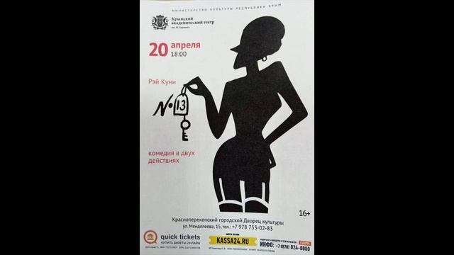 Публику ждёт встреча с обновлённой версией спектакля «№ 13». В своё время постановка Анатолия Новикова по блистательной комедии Рэя Куни стала лидером продаж и на долгие годы одним из самых популярных спектаклей нашего театра. «№ 13» — это настоящий фейерверк неожиданных (часто, весьма пикантных) происшествий, путаницы и недоразумений. Эксцентрические ситуации, в которые попадают герои, невероятны. Главный герой — британский политик предпочёл парламентским дебатам свидание с секретаршей в гостиничном номере. Но уединению влюбленных помешал незнакомец, и завертелась череда забавных событий. Режиссёр новой версии «№ 13» народный артист Украины Виктор Навроцкий. В ролях: заслуженные артисты Республики Крым Дмитрий Ерёменко, Александр Чернышев, Константин Гапонов, Игорь Кашин, Кристина Овчаренко, Нина Станиславская и Юлия Островская, заслуженные артистки АРК Елена Сорокина и Эльмира Погосян, артисты Татьяна Стасюк, Александр Денисенко, Андрей Чаквитая, Андрей Пензин, Антон Навроцкий Премьера новой редакция спектакля – 31 октября 2019 года. Продолжительность спектакля: 2 ч 20 мин.
