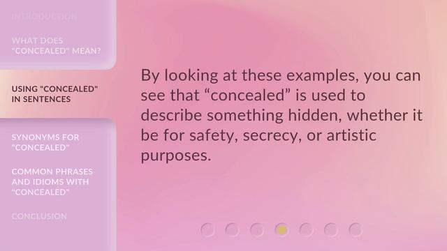 Unveiling the Meaning: Understanding 'Concealed' • Dive deep into the meaning and usage of the word 'concealed' in this captivating video. Explore its synonyms and discover how it can be used in different contexts. Join us as we unravel the mysteries of this intriguing word! 00:00 • Introduction - Unveiling the Meaning: Understanding "Concealed" 00:34 • What Does "Concealed" Mean? 01:00 • Using "Concealed" in Sentences 01:46 • Synonyms for "Concealed" 02:09 • Common Phrases and Idioms with "Concealed"