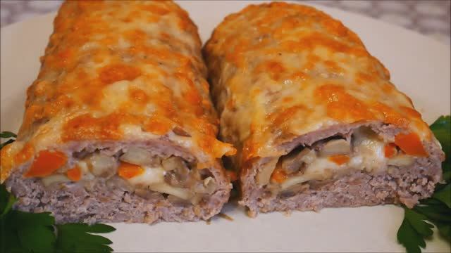 ЗАКУСКА рецепт МЯСНОЙ рулет из фарша с грибами и сыром ЗАКУСКИ на праздничный стол