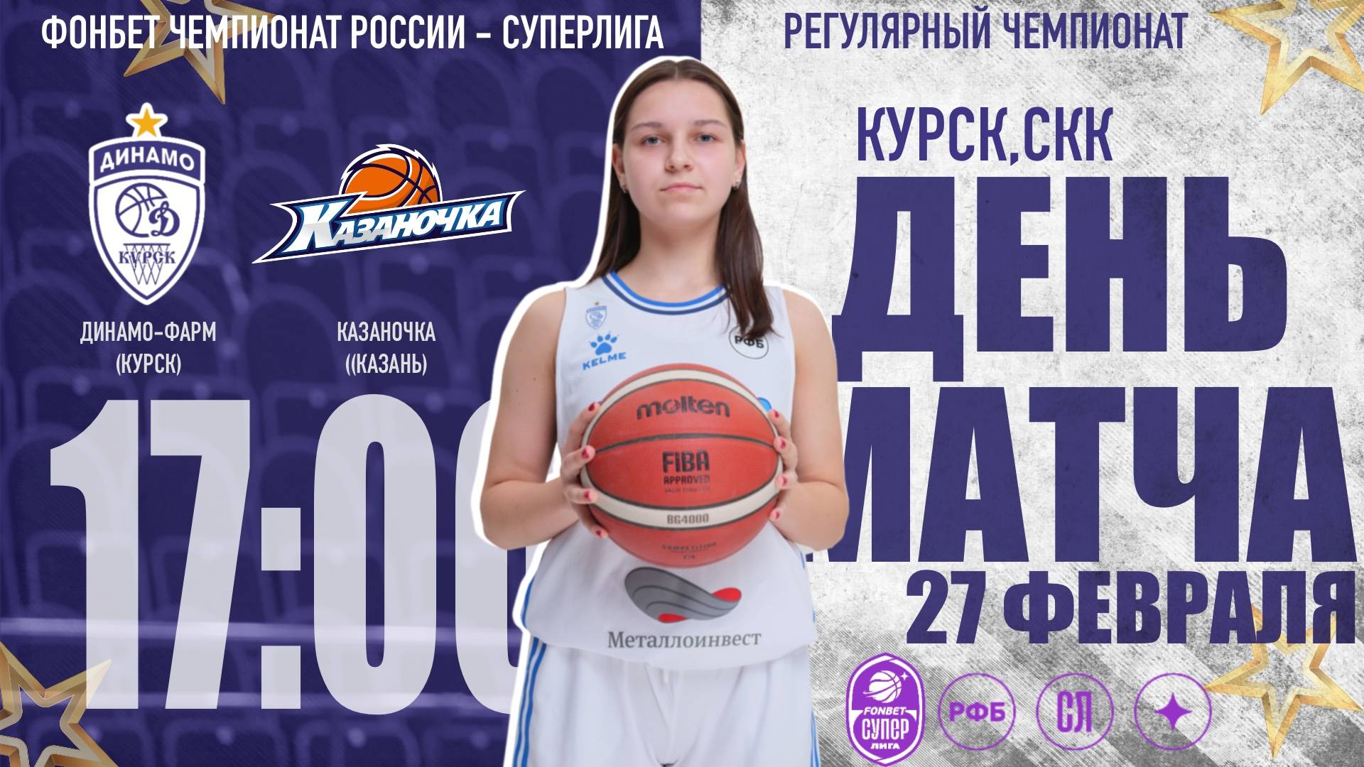 27.02.2024 17:00 Динамо-Фарм (Курск) - Казаночка (Казань) Арена: Курск, Спортивно-Концертный Комплекс Фонбет Чемпионат России - Суперлига, Регулярный чемпионат Статистика: https://russiabasket.ru/games/775115?apiUrl=https://org.infobasket.su&lang=ru