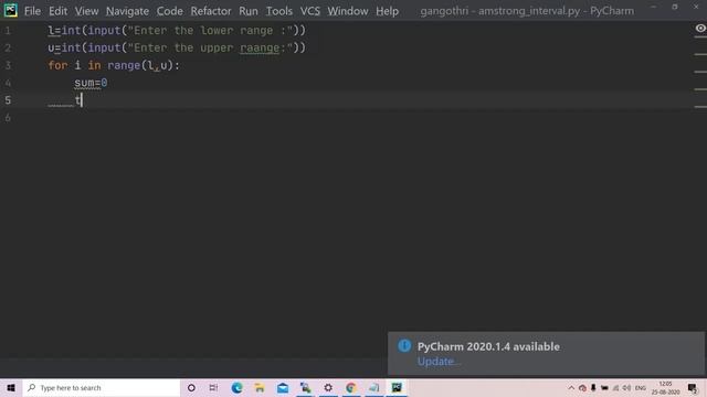 The above video is about writng a python program to print all the amstrong numbers within a given interval/If you have any doubta ,reach me out at the comments section. The above program can be written in 7 steps: -DEclaring and defining variables for lower range and upper range o the interval. -looping over all the integers between lower range and upper range using for loop. -initialising sum. -assigning the value of the number to the temporary variable. -while loop to run the loop until the number is greater than 1. -Now it's time to check if each number is an amstrong number or not. For program to check if a number is amsrong number or not: https://www.youtube.com/watch?v=TY48r9Gk7nU -Finally. check if su is equal to the number or not. -print the values