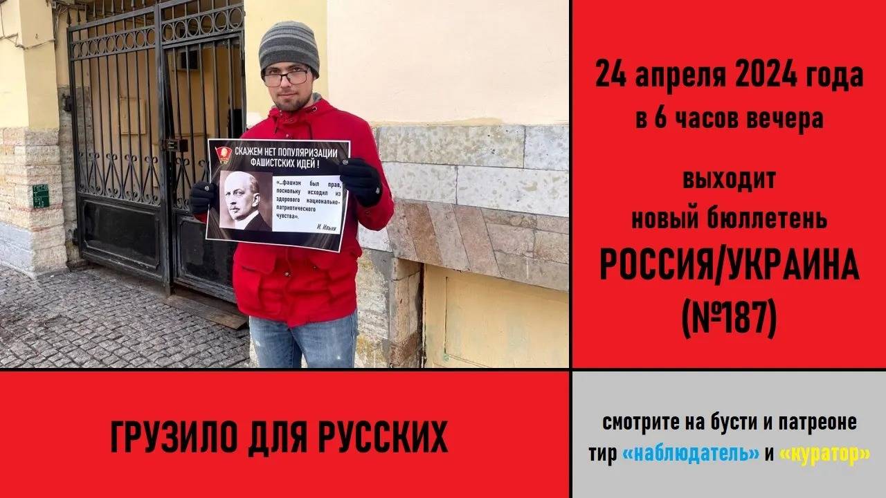 Видео с ютуба от 24 апр. 2024 г. Анонс российско-украинского бюллетеня №187. 24 апреля 2024 года в 7 часов вечера выходит новый бюллетень РОССИЯ/УКРАИНА №187 "Грузило для русских" Смотрите полную версию на бусти и патреоне на тирах «Наблюдатель» и «Куратор»: «Наблюдатель»: https://boosty.to/galkovsky/posts/fa970334-499c-4579-9843-0387061e8756 https://www.patreon.com/posts/102969370 «Куратор»: https://boosty.to/galkovsky/posts/71e8c1a8-0d17-4a90-9608-6122daab6a24 https://www.patreon.com/posts/102969489 Ждём вас!