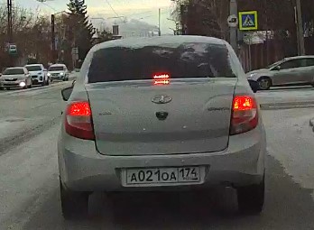 Пересечение стоп-линии и выезд на перекрёсток на запрещающий движение сигнал светофора. Госномер нарушителя А021ОА 174, LADA (ВАЗ) Granta 2017 г.в., серебристый. Перекрёсток ул. Ленинградской и ул. Суворова. 27-01-2022 п. 6.16 ПДД Дорожный знак "Стоп-линия". Место остановки транспортных средств при запрещающем сигнале светофора. п. 6.2. ПДД - жёлтый сигнал запрещает движение, красный сигнал запрещает движение, зелёный сигнал разрешает движение. п. 6.13 ПДД - при запрещающем сигнале светофора... водители должны остановиться перед стоп-линией (знаком 6.16).