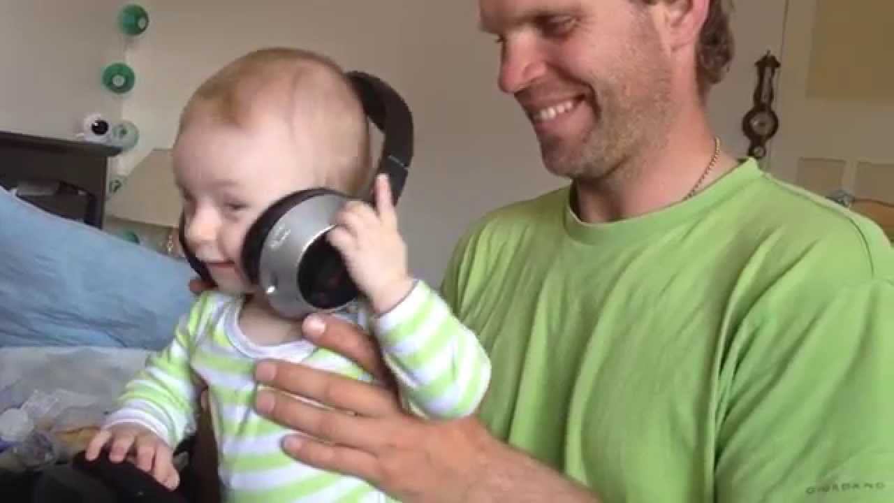 Малыш в наушниках Музон слушает
