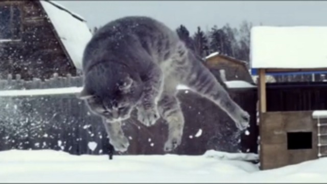 Красивое слоу-мо видео с котиком, прыгающем в снег.