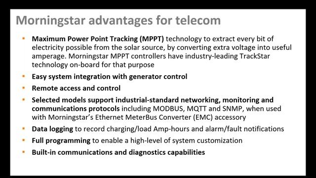 Dave Putman of Two Explorers, LLC--a leading representative of NorthStar Batteries--joins the Morningstar Team to present solar-powered solutions for commercial/industrial applications. Viewers of this recorded webinar will learn about: • The differences between energy storage chemistries, and NorthStar’s advantages in proven lead-acid battery chemistry • Review of solar charge controllers, and Morningstar’s advantages when paired with various storage formats • The pre-programmed settings you need for easily designing a commercial storage system, or upgrading an existing solar system • Morningstar’s Energy Storage Partner program Questions from the audience were addressed at the end of the webinar.