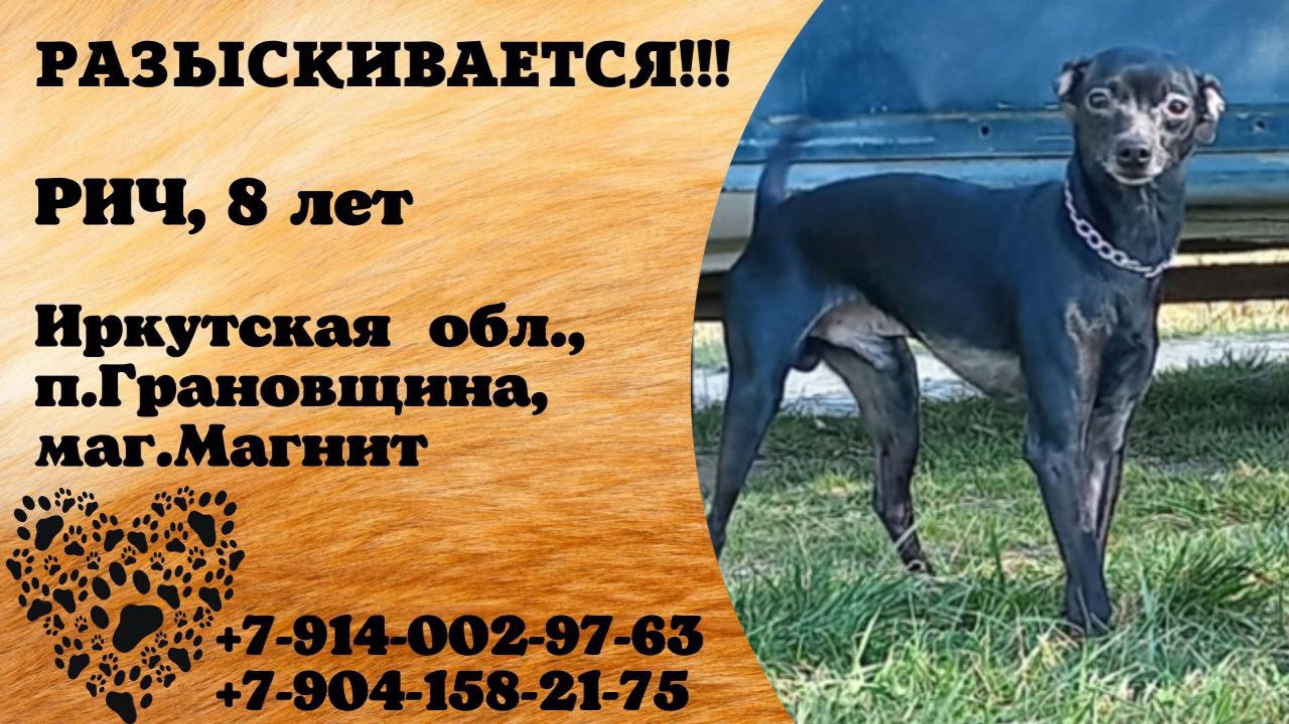 Иркутская Грановщина Пропала собака ‼ПРОПАЛА СОБАКА‼ 20.10.25 в 17:00 испугался и убежал мой песик😭 Район магазина магнит. Приметы: помесь той-пинчер возвраст 8лет, цвет черный, хвост некупированный колечком, примерный вес 2,5-3кг. Отзывается на кличку Рич. На шее зеленый тканевый ошейник с капсульным адресником. Огромная просьба всех неравнодушных присмотритесь пожалуйста может у ваших соседей появился новый питомец или вы где то видели его, любая информация будет полезной, звоните в любое время даже ночью я всегда буду на связи. Это мой друг, мой член семьи мы очень ждем его домой😭 Если кто то решил оставить себе, верните пожалуйста домой моего друга, я вам куплю такого же щенка. ЗА ВОЗНАГРАЖДЕНИЕ‼ Номера для связи: 89140029763 (основной) 89041582175 89371334803 89087724632 Инфо: https://vk.com/wall-198815410_213470 #пропала_собака #иркутская #грановщина