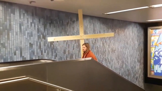 "Иисус Христос" застрял на эскалаторе из-за креста