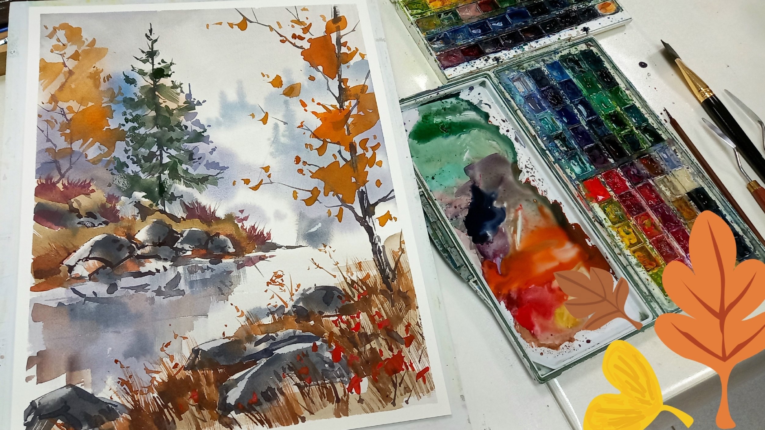 Тихая осень, подробный мастер-класс по акварели