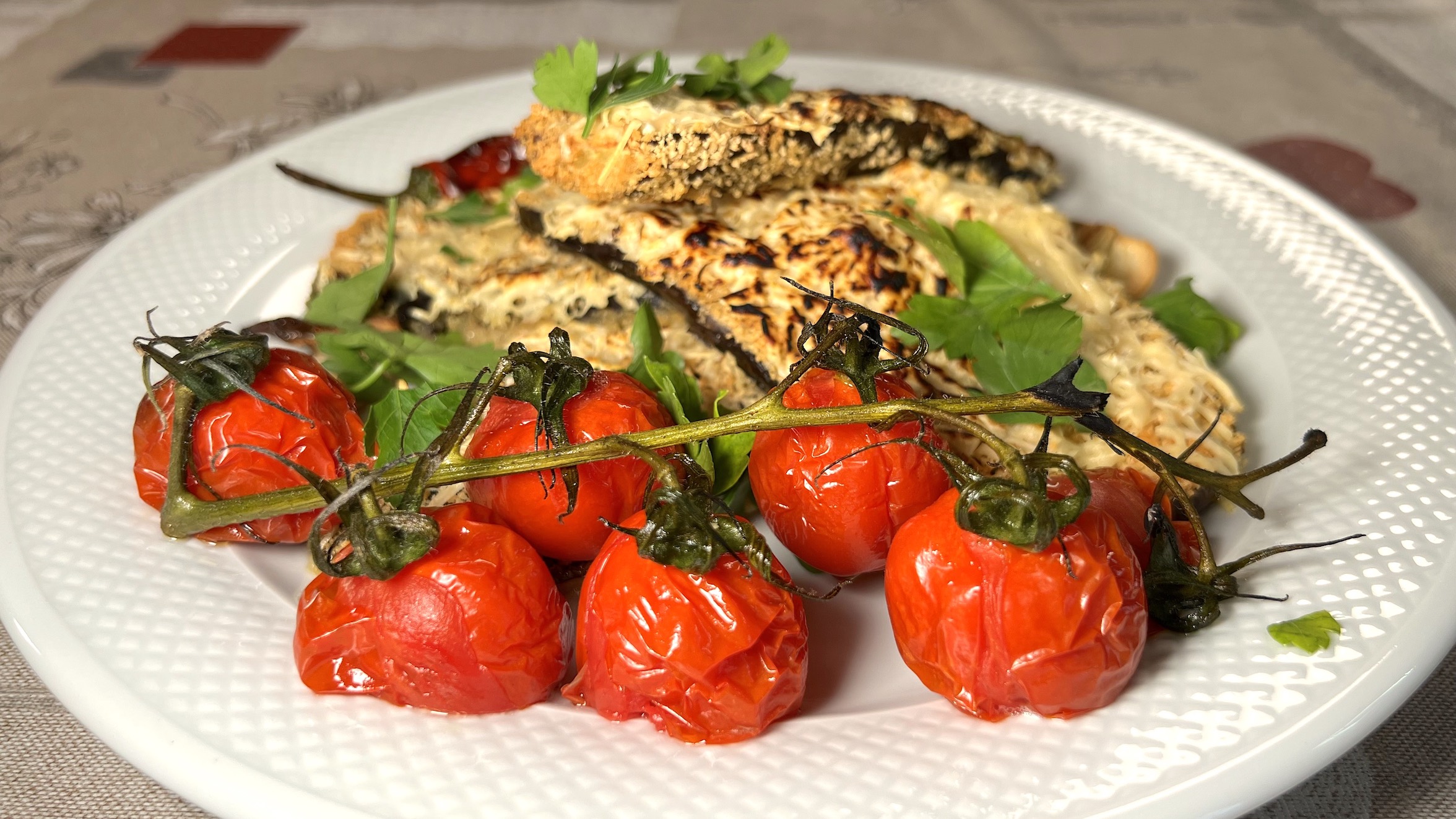Все мы привыкли к отбивным из мяса … но сегодня все меняется … сегодня отбивная из баклажана … Баклажан порезать на стейки … посолить и пока уходит горечь … займемся панировкой … яйца, панировочные сухари и пармезан … баклажаны отбить … запанировать и выложить на противень … сделать шапку из пармезана … на гарнир будут томаты черри, чеснок и острый перец … веточка тимьяна или розмарина добавят вкуса ... хорошо полить оливковым маслом и отправляем в духовку … 180°С 20-30 минут … перед подачей украсить зеленью и бокалом красного! Приятного аппетита!
