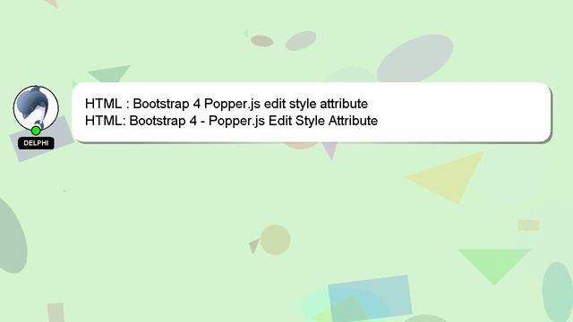 HTML : Bootstrap 4 Popper.js edit style attribute To Access My Live Chat Page, On Google, Search for "hows tech developer connect" I promised to reveal a secret feature to you, and now it's time to share it. This is a YouTube's feature which works on Desktop. First, Make sure the video is currently in playing mode. Then, type the letters 'awesome' on the keyboard. You will see a flashing rainbow instead of a regular progress bar on YouTube. Here's a short introduction about myself, Hi, my name is Delphi, nice to meet you. I am willing to help you find the solutions to your questions. HTML : Bootstrap 4 Popper.js edit style attribute I encourage you to reach out through comments or chat if you have more specific questions. Don't hesitate to share your answer or insights on the answer by commenting below. Providing an answer will be acknowledged and appreciated with a 'heart' from me. style : 4 edit Bootstrap Popper.js attribute HTML