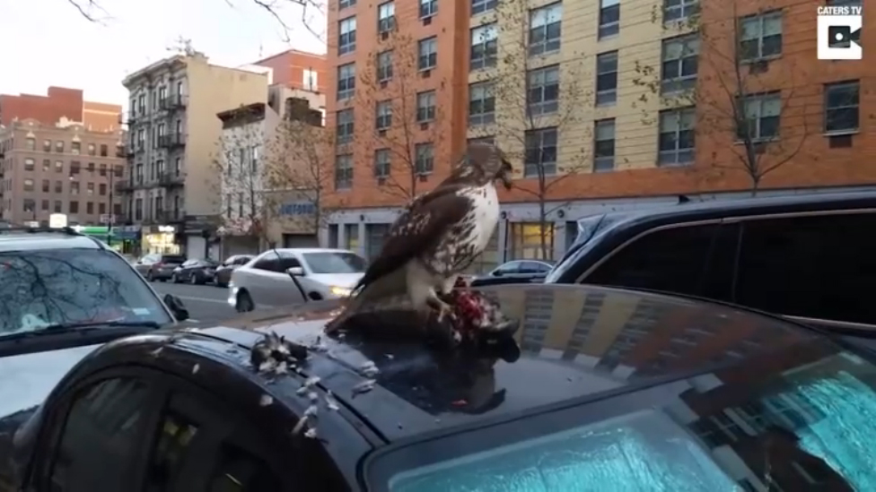 В Нью-Йорке ястреб разделал голубя прямо на крыше припаркованого автомобиля.