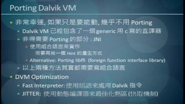 鄭孟璿 (Luse Cheng) 漢語 Android Since Android smartphone becomes popular recently, more and more programmers focus on Android system development. However, Android system is supported on ARM platform mostly. In this session, it is expected to cover details on porting android to brand-new CPU architecture and how to optimize it. Bare new CPU architecture? (Platform quick-review) OK, let go ! (Pre-requirement, bring up) Life is not fair, get used to it (Android porting guideline) How do you do your best? (Optimization) Compiler Engineer at An Embedded CPU IP Company. Compiler Lead at An Embedded CPU IP Company. Full-time Open-Source Developer. Part-time Open-Source Contributor.