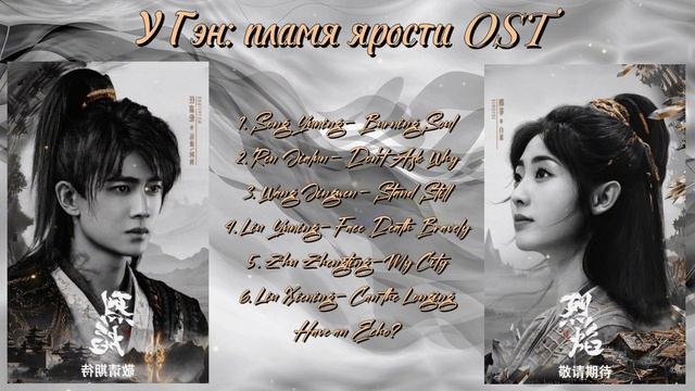Осты из дорамы "У Гэн: пламя ярости" --- Исполнитель - песня 1. Song Yuning - Burning Soul 00:00 2. Ren Jialun - Don't Ask Why 04:07 3. Wang Jingwen - Stand Still 09:17 4. Liu Yuning - Face Death Bravely 13:05 5. Zhu Zhengting - My City 17:38 6. Liu Xiening - Can the Longing Have an Echo? 21:37