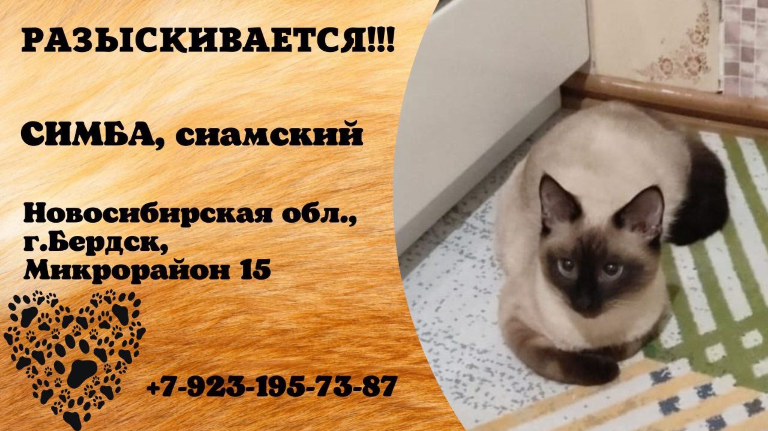 Новосибирская Бердск Пропал кот 30.03 Сбежал кот Симба, породы сиамский, с зелёными глазами. Немного косит. Помогите найти пожалуйста! Микрорайон 15 Имя хозяина: Оксана Телефон: 79231957387 Инфо: https://vk.com/wall-198815410_187426 #пропал_кот#бердск#Новосибирская #сиамский
