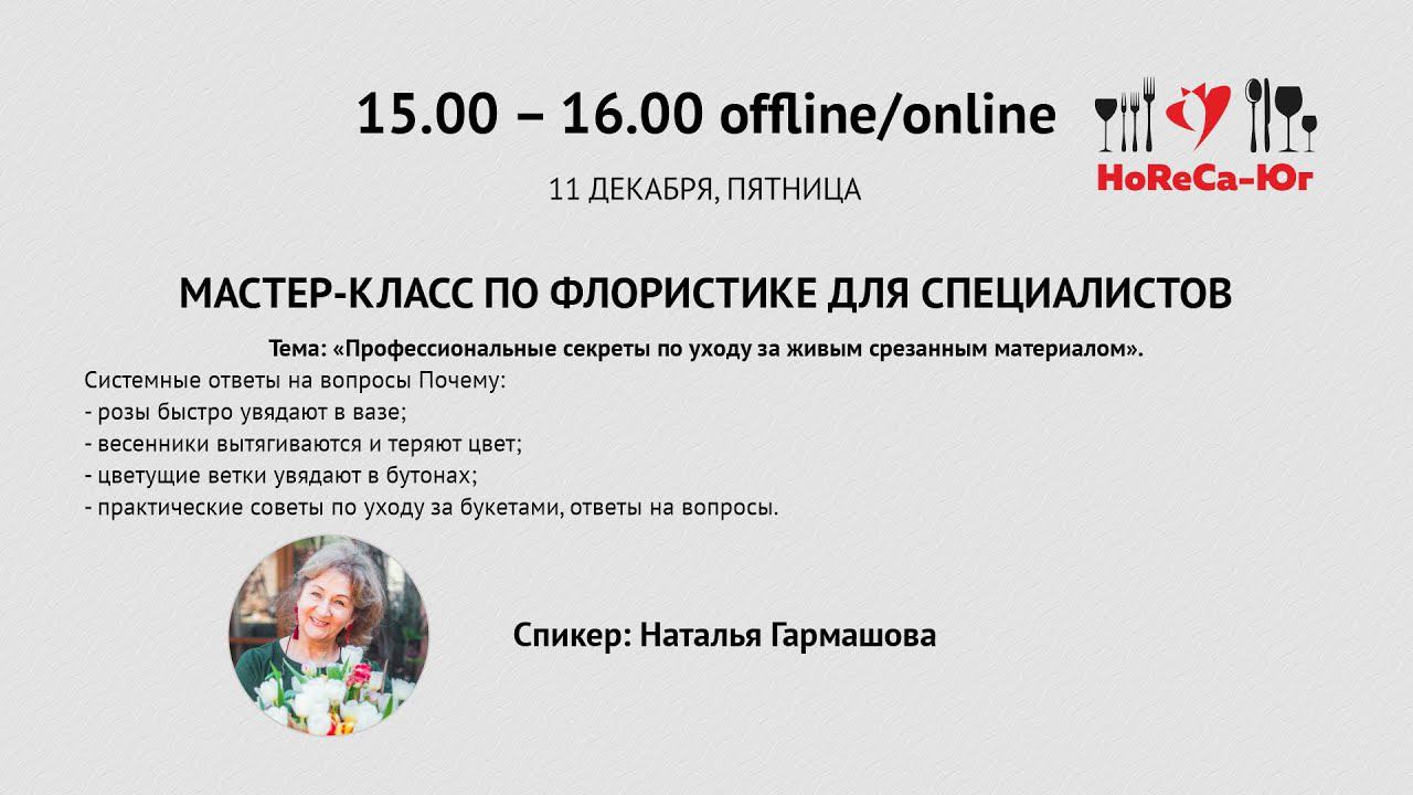 Профессиональное мероприятие индустрии гостеприимства «HoReCa- Юг – 2020»! https://horeca.soud.ru/ Спикер: Наталья Гармашова Основатель Академии Флористики и Дизайна г. СочиУчредитель Национальной Гильдии флористов России. Член Союза Дизайнеров. Мастер – флорист, ландшафтный дизайнер, преподаватель, тренер. Тема: «Профессиональные секреты по уходу за живым срезанным материалом». Системные ответы на вопросы Почему: - розы быстро увядают в вазе; - весенники вытягиваются и теряют цвет; - цветущие ветки увядают в бутонах; - практические советы и красивые идеи по благоустройству и озеленению участков.