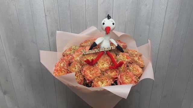 Букет из пионовидных роз с аистом на выписку