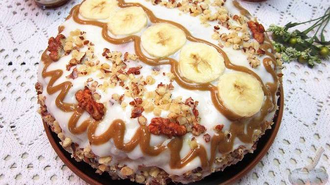 Торт-пирог из теста на банановом пюре со сливками и растительным маслом, а также с добавлением в тесто измельчённых орехов. Прослаиваются коржи вареной сгущенкой. Сверху торт покрывается взбитыми сливками. #БанановыйТорт #ТортСБананами #ТортСоСгущенкой #ТортСоСливками