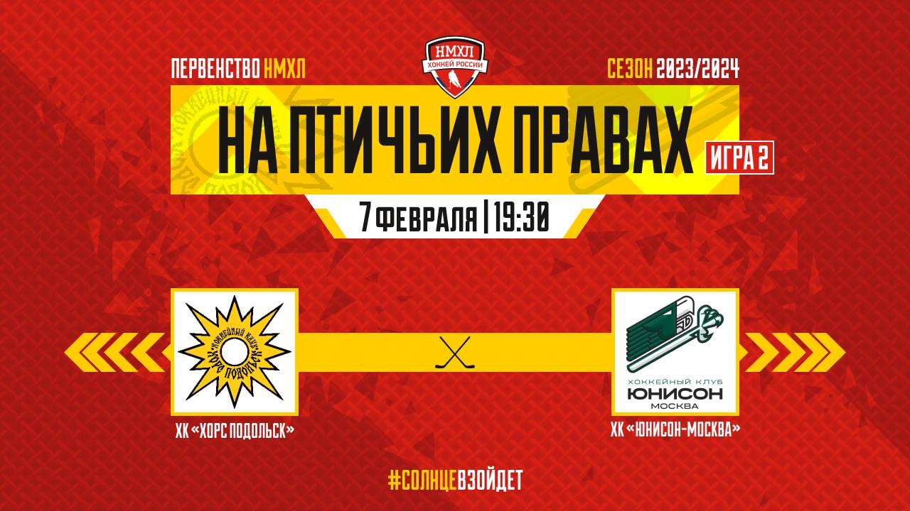 7 февраля в 19:30 любителей хоккея ждет второй матч, в котором дебютант сезона 2023/2024 Национальной молодежной хоккейной лиги ХК«Хорс Подольск» сразится с лидером Западной конференции ХК «Юнисон-Москва» Первый матч получился для подольчан крайне неудачным, но сегодня подопечные Игоря Велькера сделают все возможное, чтобы изменить ситуацию и набрать необходимые очки. Присоединяйтесь к трансляции и поддерживайте любимую команду в чате. ?