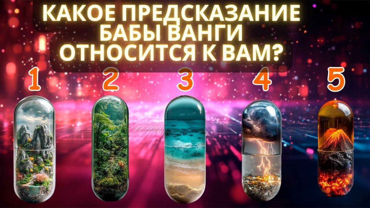 Сегодня мы откроем врата между временем и судьбой. Перед вами – пять капсул времени. В каждой заключён символический образ – отголосок предсказания великой провидицы Бабы Ванги. Эти послания приходят не разумом – а сердцем. Какой образ потянул вас первым? Какая капсула зацепила душу? Выберите свою – и узнайте, какое из древних пророчеств, возможно, касается именно вас. Таймкод: 00:00 - Начало 01:28 - Капсула №1 – Скалы и Тишина 06:00 - Капсула №2 – Джунгли Жизни 11:00 - Капсула №3 – Океан и Песок 15:41 - Капсула №4 — Гроза Над Судьбой 20:30 - Капсула №5 — Ядро Земли 25:24 - Заключение