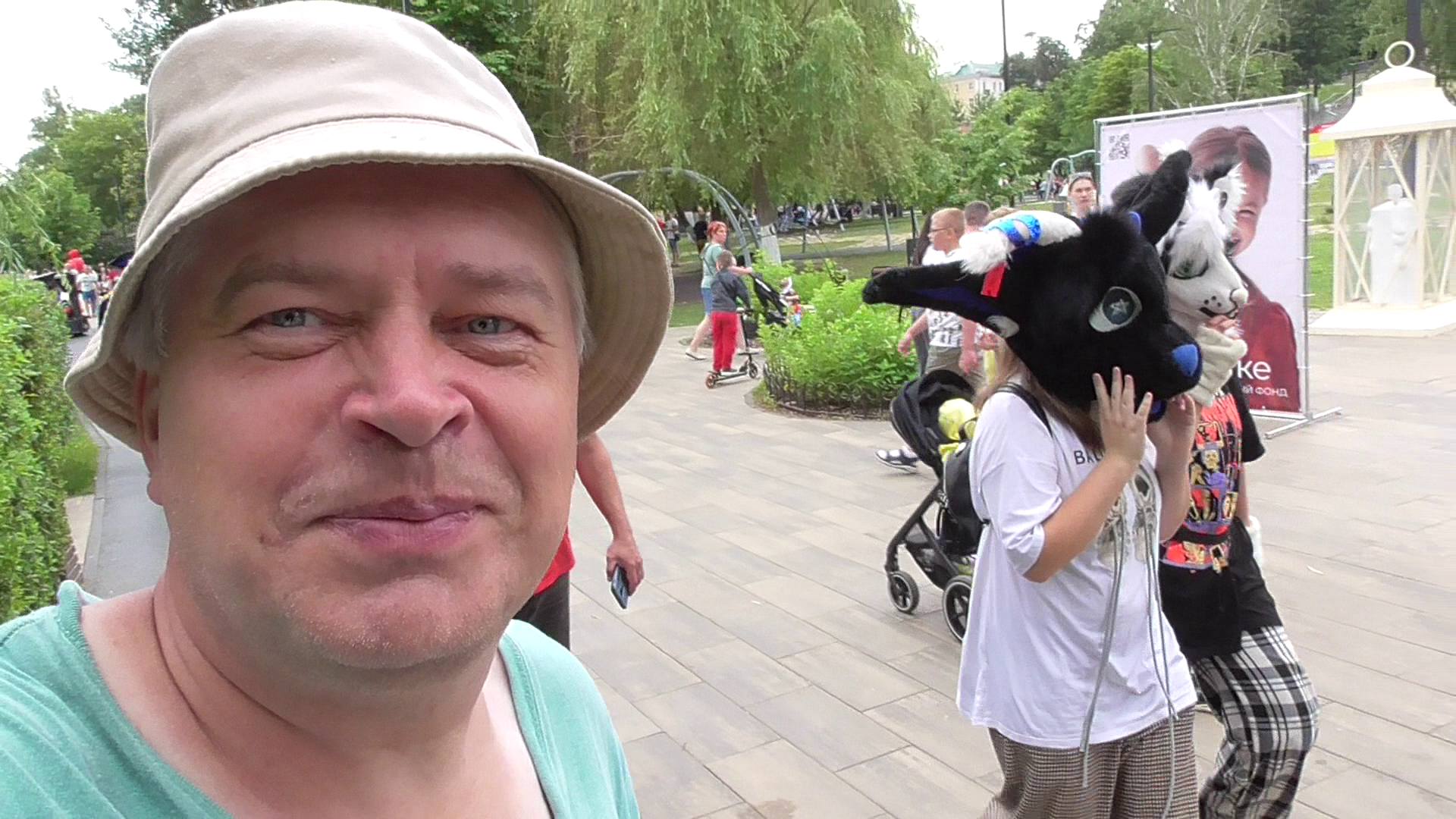 Геннадий Горин и люди в масках в парке