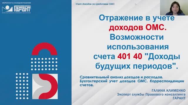 Как организовать учет доходов, полученных за оказание медицинской помощи в рамках ОМС. Когда доходы следует отразить на счете 401 40 "Доходы будущих периодов". Об этом расскажет Клименко Галина - консультант-эксперт направления "Бюджетная сфера" компании ГАРАНТ. __________ Получить бесплатный доступ к системе ГАРАНТ https://garant.pravovest.ru/ __________ ТАЙМКОДЫ: 00:00 В этом видео 00:39 Сравнительный анализ доходов и расходов 01:57 Расчеты за оказанную медицинскую помощь 04:04 Анализ доходов и расходов по итогам отчетного периода 05:24 Применение счетов учета 401 10 и 401 40 07:35 Корреспонденции счетов по доходам от оказания медпомощи по ОМС 10:40 Примеры корреспонденций счетов по доходам от оказания медпомощи по ОМС 15:59 Примеры корреспонденций счетов по доходам от оказания медпомощи по ОМС (продолжение)