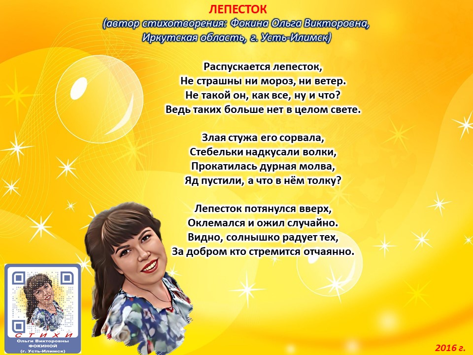 Читает автор стихотворения: ФОКИНА ОЛЬГА ВИКТОРОВНА (Иркутская область, город Усть-Илимск) СТИХИ: https://stihi.ru/2018/07/08/3790 БИОГРАФИЯ: http://www.proza.ru/2019/10/08/1473 ВЫИГРЫВАЙТЕ КНИГИ БЕСПЛАТНО: https://proza.ru/2017/09/17/447 ОТЗЫВЫ ЧИТАТЕЛЕЙ: http://www.proza.ru/2019/11/29/611 Из книги Фокиной Ольги Викторовны (Усть-Илимск) «Несу добро в ладошках!»: [все стихотворения с 2005 по октябрь 2020 гг., проза, авторские песни, интервью]. – Москва: МГО Союза писателей России, 2020 г. – 886 стр., ил. ISBN 978-5-7949-0826-8 ЛЕПЕСТОК (автор стихотворения: Фокина Ольга Викторовна, Иркутская область, г. Усть-Илимск) Распускается лепесток, Не страшны ни мороз, ни ветер. Не такой он, как все, ну и что? Ведь таких больше нет в целом свете. Злая стужа его сорвала, Стебельки надкусали волки, Прокатилась дурная молва, Яд пустили, а что в нём толку? Лепесток потянулся вверх, Оклемался и ожил случайно. Видно, солнышко радует тех, За добром кто стремится отчаянно. 17 марта 2016 г.