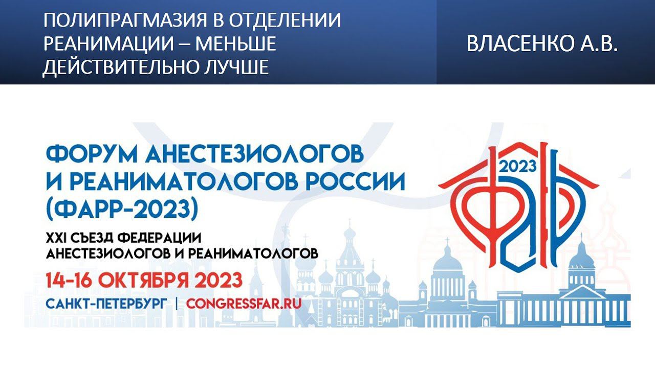 Видеозапись ФАРР-2023, XXI съезд Федерации анестезиологов и реаниматологов 14-16 октября 2023, Санкт-Петербург. Алексей Викторович Власенко "Полипрагмазия в отделении реанимации – меньше действительно лучше"