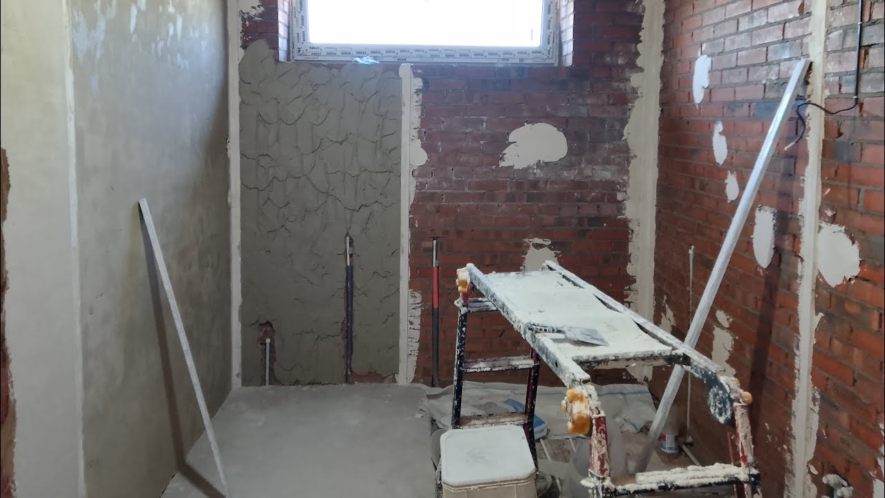 Установка гипсовых маяков.Штукатурю цементно гипсовой штукатуркой.