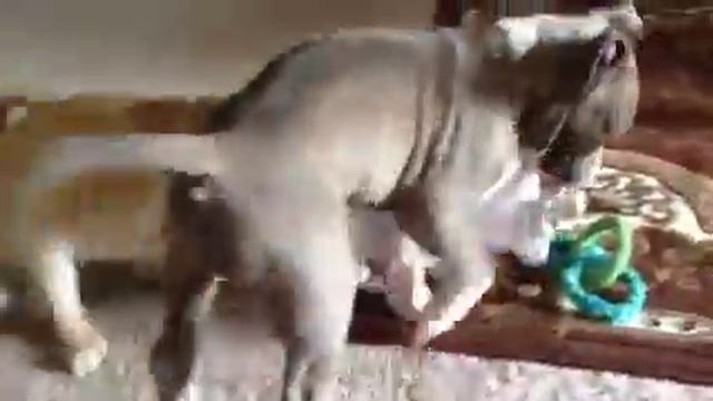 Pitbull and Norwewgian buhund puppy play