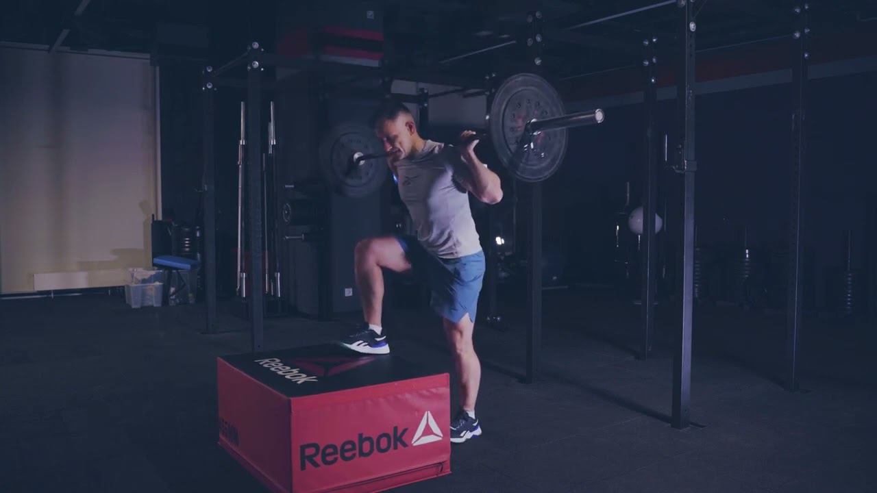 Зашагивания на коробку со штангой на плечах / barbell box step up
