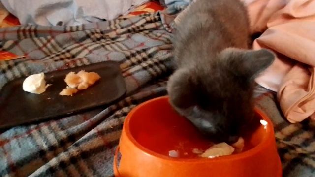 Мишка уже наелся ушел а Тишка подьедает остатки.