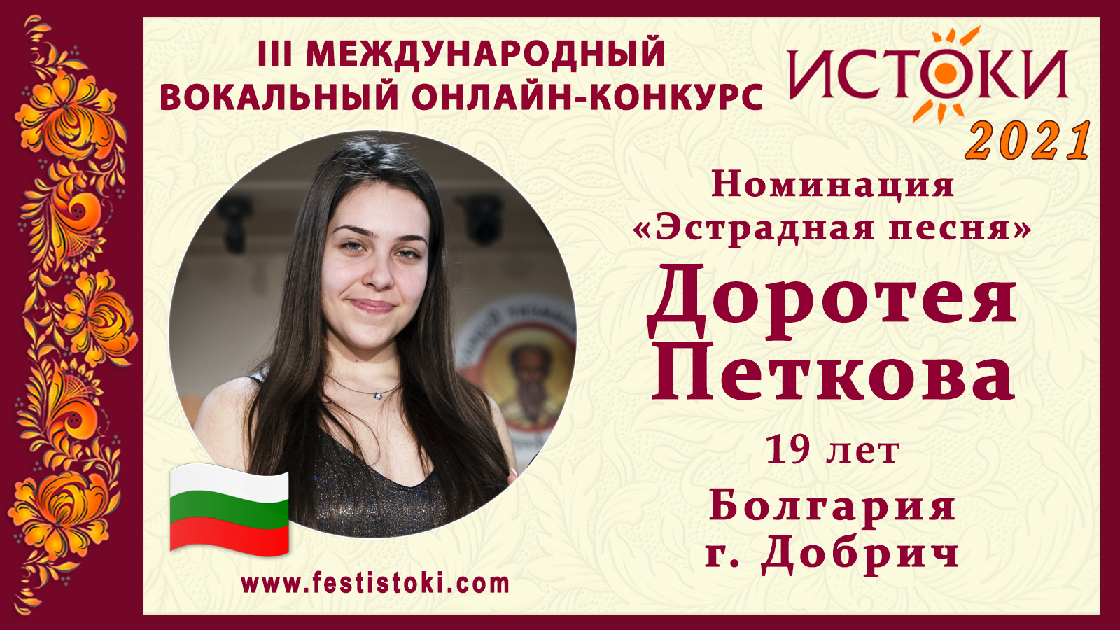 Лауреат III степени III Международного вокального онлайн-конкурса «Истоки». Номинация "Эстрадная песня". Песня "I will always love you" Авторы: Dolly Parton, Amanda Cole Сайт: www.festistoki.ru / www.festistoki.com E-mail: festistoki@mail.ru
