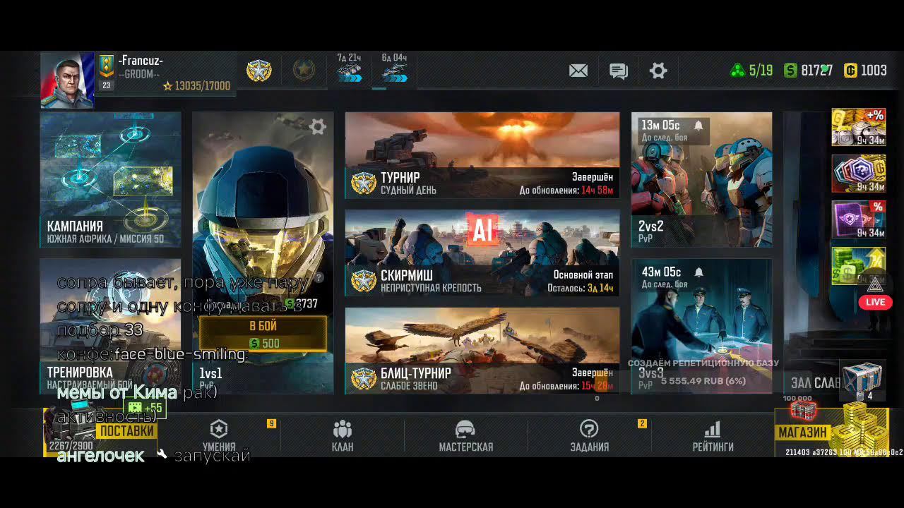 Поддержка автора по ссылке: https://www.donationalerts.com/r/rincks Бланк банк 4375571500040653 телеграм группа для подписчиков https://t.me/art_of_war_3_rincks_sopra Продлить стрим:300 руб Смена фракции:200 руб Тренировка:300 руб 2х2: по совести Покажи кач: миллион рублей Закончить стрим:1000 руб Так же можно заказать челлендж. тоесть дать стримеру задание за определенную сумму. Например: сыграть только авиацией или вообще без неё,ну и так далее. Ссылка на игру: Долго искал настоящую стратежку на телефон, как старкрафт. Наконец нашел Art of War 3! Очень крутая игра! Вот ссылка, качай, тебе понравится: https://redirect.appmetrica.yandex.com/serve/169878688668608468?recruiter_id=1111515909
