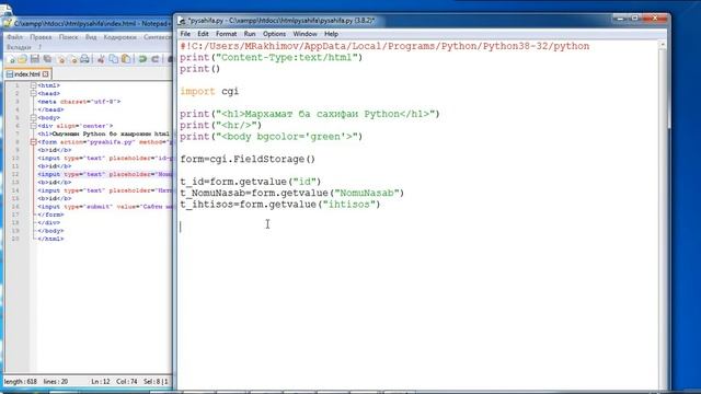 Дар ин дарс шумо метавонед шинос шавед, чи гуна: 1. XAMPP - сценарияи Python-ро дида метавонад 2. HTML-сахифа ба сценария Python маълумотро бо методи POST медихад 3. Python-сахифа маълумотро ба базаи MySQL сабт мекунад Истифода шудааст: XAMPP HTML PYTHON cgi mysql.connector SQL дархости Insert