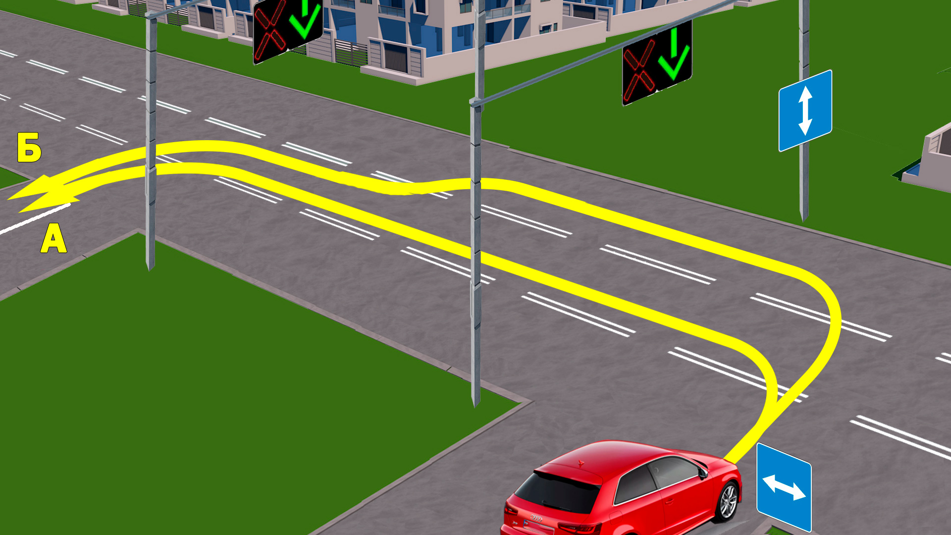 По какой траектории разрешено движение водителю легкового автомобиля в данной ситуации?