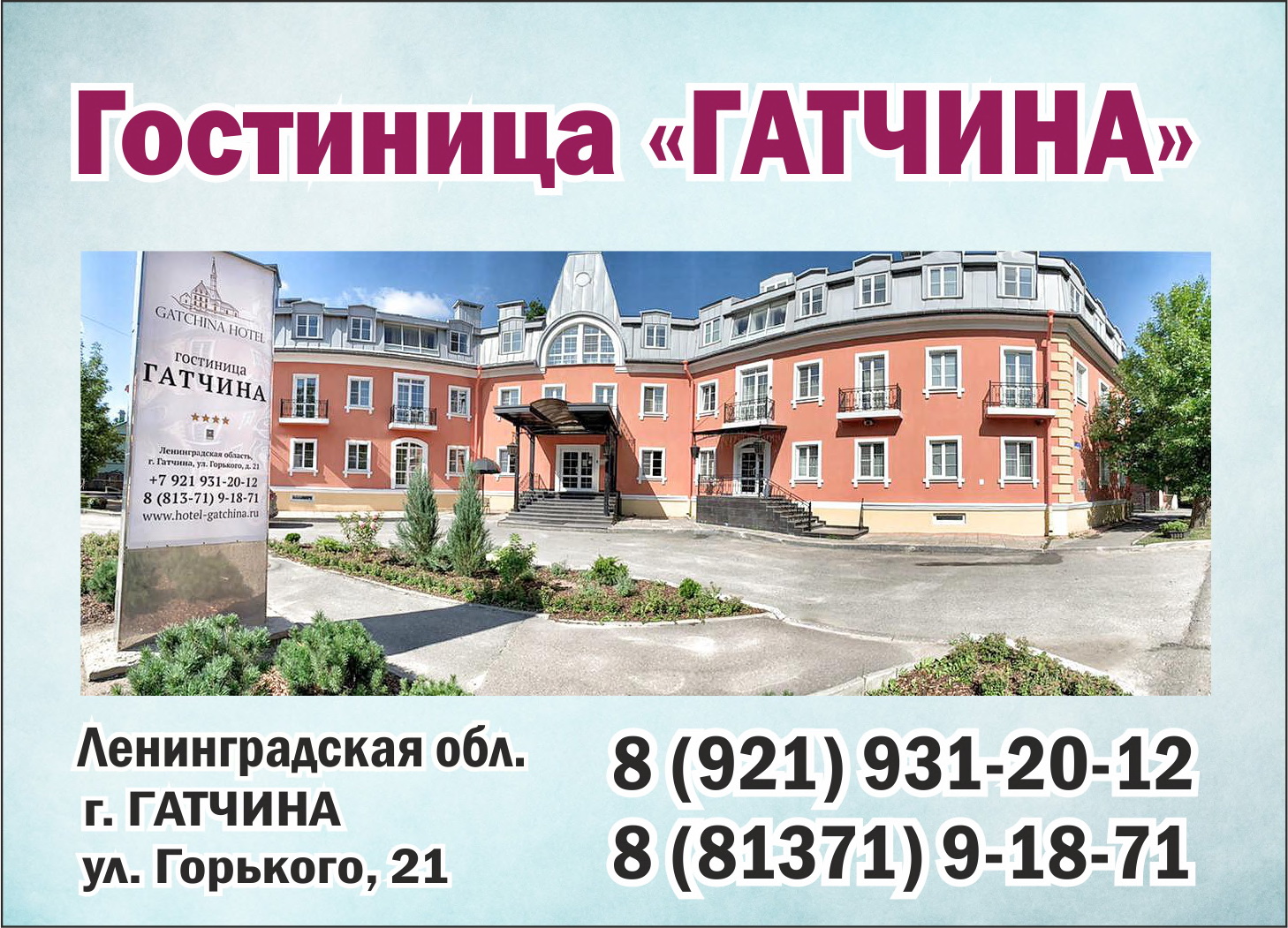 Отель "Гатчина" находится в 27 км от аэропорта Пулково и в 33 км от станции метро "Московская" г. Санкт-Петербурга, на тихой улице в историческом центре Гатчина. В шаговой доступности от отеля расположены основные достопримечательности Гатчины: Большой Гатчинский Дворец, Приоратский Дворец, живописный Дворцовый парк, Гатчинский Кафедральный и Покровский соборы и многое другое. Отель построен в стиле петровского барокко и напоминает городские усадьбы петербургской знати середины XVIII века. К услугам гостей предлагается 23 номера различных категорий. Наши преимущества: - Удачное расположение в историческом центре города Гатчина; - Единственный четырехзвездный отель в Гатчине; - Наша гостиница новая, все номера со свежим ремонтом; - В каждом номере телевизор с плоским экраном и кабельными каналами, чайник, холодильник и собственная ванная комната с туалетными принадлежностями и феном; - Wi-Fi на территории всей гостиницы бесплатно; - Ежедневная уборка; - Континентальный завтрак включен в стоимость проживания; - Бесплатная охраняемая парковка; - Англоговорящий персонал; - Стойка регистрации работает 24 часа; - Приемлемые цены (от 2000 руб.) и высокий уровень обслуживания; - Комфортный конференц-зал; - Просторный банкетный зал; - 25 минут езды до аэропорта и станции метро "Московская" в Санкт-Петербурге; организовываем трансфер. Ленинградская область, г. Гатчина, ул. Горького, д. 21. Телефон: 8 (921) 931-20-12 Тел/факс: 8 (81371) 91-871 Сайт: hotel-gatchina.ru