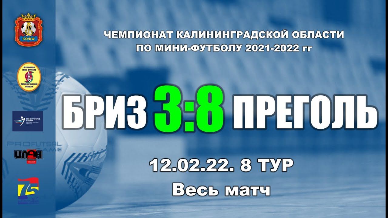 12.02.22. Чемпионат Калининградской области по мини-футболу. Суперлига. 8-й тур. «Бриз» - «Преголь» 3:8 (2:4). Весь матч Голы забили: А.Ишмаев (8'), Д.Бирюков (15'), Г.Васильев (24', АГ) -- Д.Гончаров (1', 3'), И.Кочура (6'), А.Рундау (12'), А.Хома (31', 39'), Д.Мальцев (37'), С.Михайлов (39') Предупреждены: В.Борисюк (Б), А.Крупин (Б) -- Д.Мальцев (П) Удалены: нет