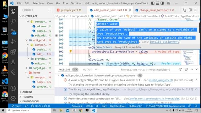 In this video, I've solved an error. The error is ""A value of type 'Object?' can't be assigned to a variable of type 'ProductType'."" Who following my Ecommerce series, this video is for you. Because you'll get this error for flutter upgrade. I started the e-commerce series when the flutter version was 1.7. So After flutter upgrade 2.0, for null safety, you'll get this error. So it may helpful for you. Subscribe to my channel: @LearnFlutterWithSmrity #flutter #flutterNullSafety #AValuOofType'Object?'Can'tBeAssignedToAVariableOfType'ProductType'