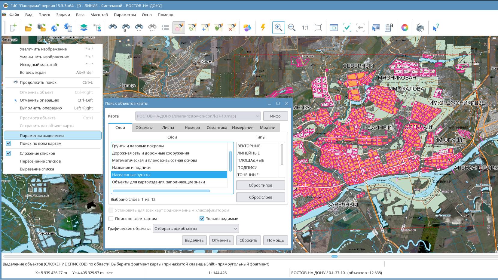 Работа режимов выделения объектов карты