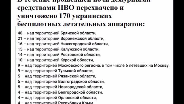 В течение прошедшей ночи дежурными средствами ПВО перехвачено и уничтожено 170 украинских беспилотных летательных аппаратов: