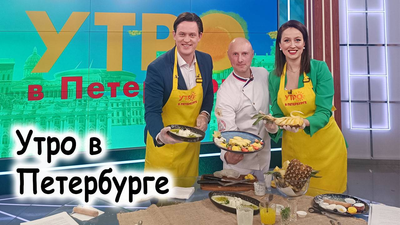 Шеф-Россия.рф скачать: книги, меню, ттк, рецепты, школа, мастер классы. Встречайте новый день с утренней информационно-познавательной программой «Утро в Петербурге»! Отметим всемирный день ананаса с Петром Марковым, шеф-поваром Дивизиона Шеф-Россия.рф, приготовив несколько необычных блюд. Как сделать утро добрым, а день удачным расскажут ведущие утреннего эфира на телеканале «Санкт-Петербург». События и факты культурной жизни, важные даты, полезные советы, интересные гости. Афиша городских событий — куда сходить в Петербурге сегодня?! «Утро в Петербурге» помогает настроиться на позитивный лад и сохранить бодрость духа на целый день. Ведущие и гости студии обсуждают актуальные городские темы, дают ценные рекомендации, делятся опытом. В эфире главные городские события: выставки, фестивали, показы, открытия, презентации, творческие встречи, концерты, кинопремьеры. Встречайте «Утро в Петербурге» на телеканале «Санкт-Петербург» 1. Как быстро и просто почистить, и порезать ананас 2. Красиво порезать ананас на праздничный стол «Лебедь» (Карвинг) 3. Бабачка из ананаса (Карвинг) 4. Моти с ананасом 5. Бланманже с копченым ананасом в соусе Пина колада с тапиокой Несколько интересных фактов об ананасе: • С ботанической точки зрения ананас не является фруктом. Это даже не ягода, а несколько десятков ягод, сросшихся вокруг общего центра. • Все культурные сорта ананаса являются бесплодными. Они не образуют семян, а размножаются вегетативно, с помощью побегов. • Ананас не продолжает поспевать после того, как его сорвали. Если его плод срезали зелёным, он так и останется зелёным, в отличие от бананов или других фруктов, которые при хранении могут поспеть. • Плод ананаса, а особенно его центральная жёсткая часть, содержит очень высокий процент бромелайна. Это особый фермент, который обладает рядом полезных свойств. Он оказывает противовоспалительный эффект, а также способствует быстрому расщеплению жиров и белков в организме. • Листья ананаса в некоторых странах используют в качестве сырья для производства плотной ткани и материалов. В странах, где традиционно выращивали культуру ананаса, из его прочных листьев делали циновки и рыбацкие сети. • В Китае ананас является обязательным атрибутом праздничного стола во время празднования Нового Года по восточному календарю. Существует поверье, что если на столе стоит ананас, то наступающий новый год будет успешным и семью ожидает процветание. Тапиока — это шарики из крахмала, которые получают из корней маниоки. Также может быть в виде белой муки или хлопьев. Маниока произрастает в экваториальных странах Африки, Южной Америки и Азии. По технологии клубни растения сначала вымачивают несколько дней в воде, затем растирают и снова смешивают с жидкостью. В процессе производства на дно оседают хлопья крахмала. Процедура повторяется несколько раз, пока не останется очищенный порошок, который в дальнейшем идёт на продажу. Тапиоку используют для добавления в выпечку, в основном в хлеб и лепёшки, пудинги и другие десерты, лапшу удон, кашу, чай, кофе. Кроме этого, тапиоку применяют в качестве загустителя для приготовления супов, соусов, подлив. Также крахмал встречается в рецептах бургеров и наггетсов. Главное преимущество тапиоки в том, что в её крахмале нет глютена. Благодаря этому блюда с тапиокой годят