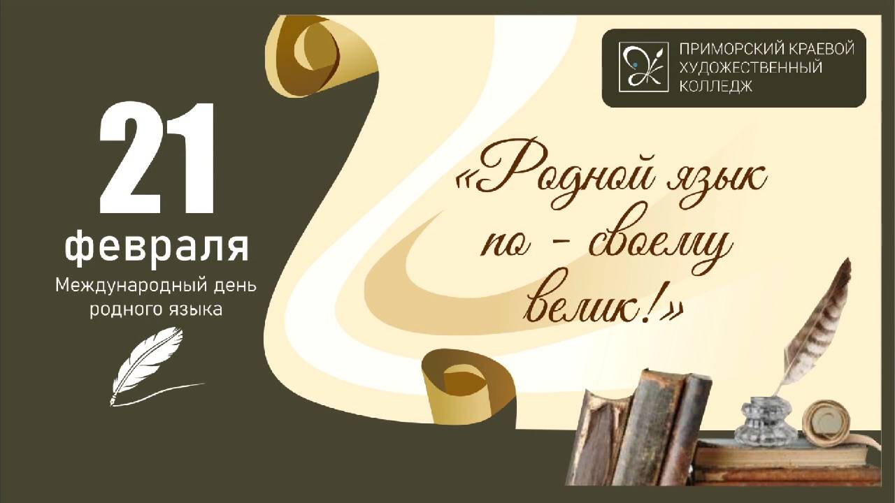 Приморский краевой художественный колледж поздравляет всех с наступающим праздником, с Днем родного языка! Этот праздник напоминает нам о важности сохранения и развития языкового разнообразия, о богатстве культур и традиций, которые передаются из поколения в поколение. Язык — это не просто средство общения, это душа народа и его идентичность. Давайте ценить и уважать наш родной язык, а также языки народов, живущих рядом с нами. Пусть каждый из нас внесет свой вклад в сохранение языкового наследия и популяризацию родного языка! С праздником!