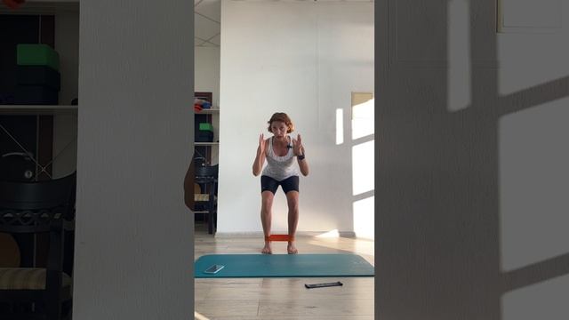 Домашний комплекс для отводящих мышц ног Реквизит: резинки круговая короткая разной степени жестокости 1. Средняя ягодичная мышца (СЯМ) - лежа на боку, резинка выше колена, средней жестокости - от 20 раз и до утомления 2. Отводящие мышцы бедра - лежа на боку, резинка на голеностопном суставе, средней жестокости - 20 раз 3. Приседания симметричные - стоя, ширина тазовых костей, резинка на голеностопном суставе, высокая степень жестокости: 20-30 раз 4. Приседания ассиметричные - стоя, ширина тазовых костей, одна стопа на полстопы впереди, высокая степень жесткости - по 10-15 на каждую 5. Шаги в сторону - стоя, резинка на голеностопном суставе, средняя степень жетскости - по 4 шага в каждую сторону, то есть 8 шагов в обе стороны; повторяем 4 раза